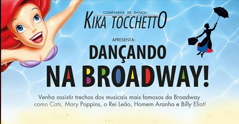 Companhia de Dança Kika Tocchetto promete um dia especial! Seguindo a tendência de encenar os musicais da Broadway no Brasil, a diretora da companhia, a bailarina e coreógrafa Kika Tocchetto, levará para o palco do Teatro Acbeu no sábado, 12, às 17h30, o musical infantil Dançando na Broadway, com trechos de peças como Cats, O Rei Leão, Mary Poppins e O Homem Aranha, entre outros. O espetáculo, com uma hora de duração, reunirá no palco 13 artistas entre bailarinos e cantores com figurinos e cenários assinados pela própria companhia de dança.