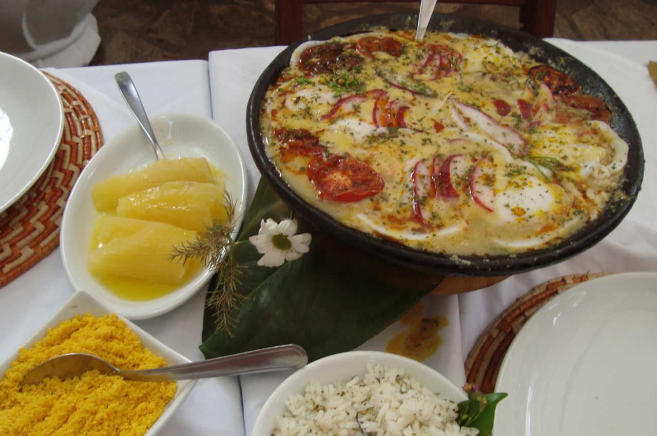 Acomodada em uma mesa estratégica ao ar livre, de onde se via parte do pomar, pude escutar, observar, absorver e beber da inesgotável fonte de conhecimento que é Beto Pimentel; Alí, duas amigas e eu desfrutamos da companhia do Chef duarante o almoço que nos ofereceu: uma moqueca de peixe com camarão, decorada com jambo fresco e cozida na água do côco verde batido com sua polpa, fruto de dendê, folha e fruto de vinagreira, lâmina de coco verde, maturi, temperos especiais aromáticos, pimenta de biquinho e azeite de oliva extra virgem. Como guarnição, aipim cozido e regado com manteiga de garrafa, arroz e farofa. Uma maravilhosa experiência gastronômica!